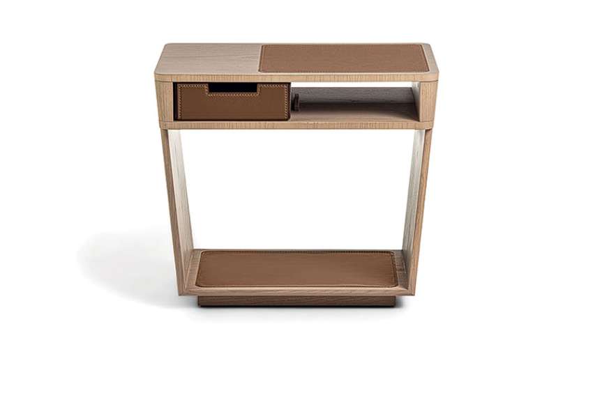 Прикроватный столик Ado в минималистичном стиле, выполнен из массива дерева и дополнен вставкой из кожи Cuoio с контрастной строчкой, зеркально отражающейся в основании, что придает ему особую элегантность. Открытое отделение позволяет добавить ящик, также обтянутый кожей. Благодаря своему лаконичному и современному виду, Ado изящно обставляет спальную зону.