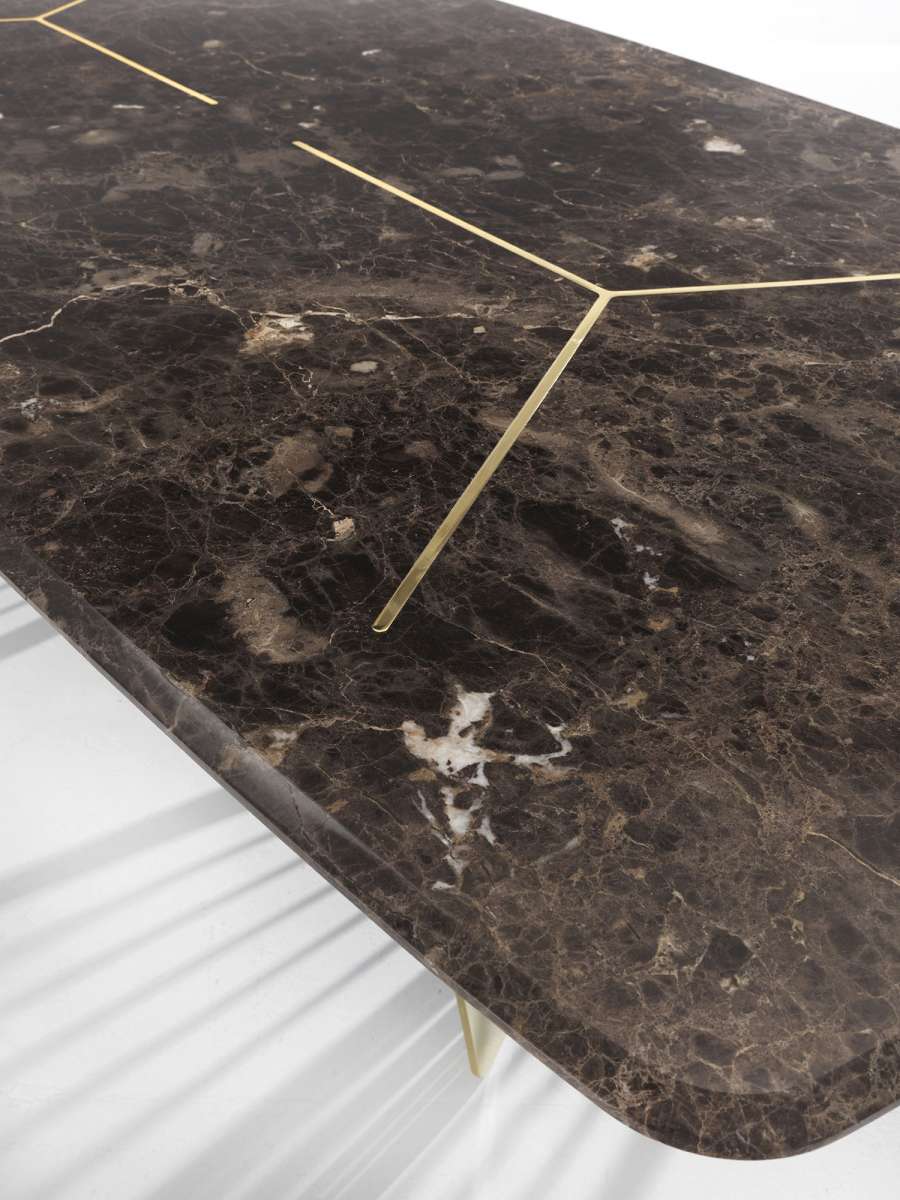 Лёгкость и прочность – оксюморон, воплощенный в консоли Alfieri. Уникальные металлические основания отличаются вертикальным дизайном, чередующим полные и пустые секции. Мраморная столешница украшена металлической инкрустацией, повторяющей линии оснований, что создаёт визуальную и цветовую непрерывность. В одноимённую коллекцию также входят небольшие столики и консоли, что делает её комплексным решением.