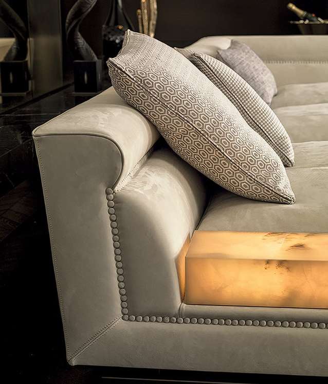Прямые и изогнутые линии, идеально гармонирующие друг с другом, очерчивают мягкие формы дивана Ansel. Элегантные пуговицы украшают его профиль, придавая изделию элегантный и стильный характер. Коллекция состоит из различных предметов, которые могут использоваться в качестве самостоятельных островных элементов или присоединяться друг к другу для получения необычных композиций. Отличительной особенностью является низкий подлокотник со вспомогательной поверхностью из оникса с подсветкой. Строгие формы и компактные объемы позволяют Ansel свободно и элегантно облачаться в любую ткань и кожу из эксклюзивной текстильной коллекции Longhi.