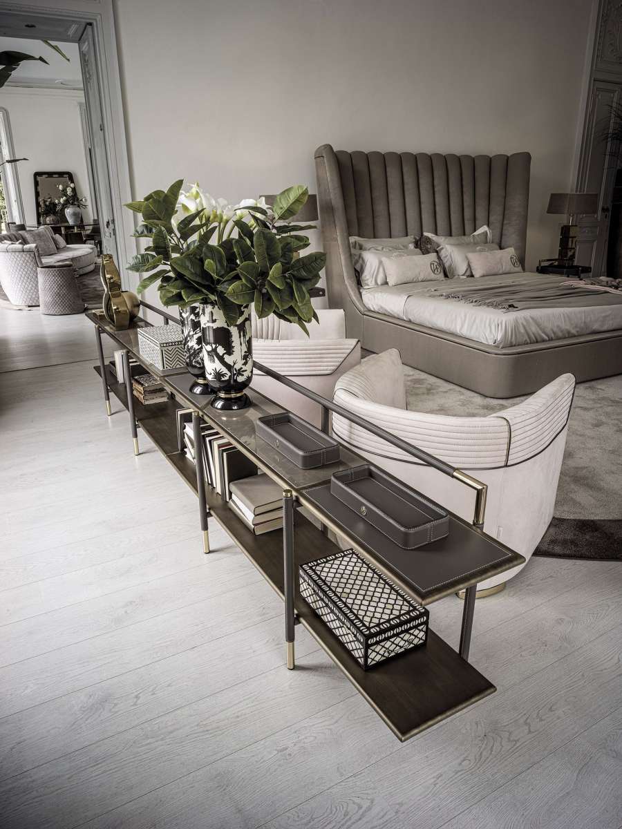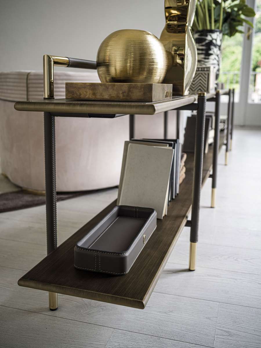 Коллекция Araldo отличается богатством материалов, фактур и гибкостью. В частности, консоль Araldo с воздушной структурой и кожаной обивкой с золотистыми деталями подчёркивает красоту материалов: верхняя столешница украшена бордюром из патинированного бронзового дерева со вставками из керамогранита с мраморным эффектом и кожи, гармонирующими с конструкцией. Нижняя полка выполнена из патинированного бронзового дерева. Araldo — это предмет мебели, в котором чёткая форма является манифестом.