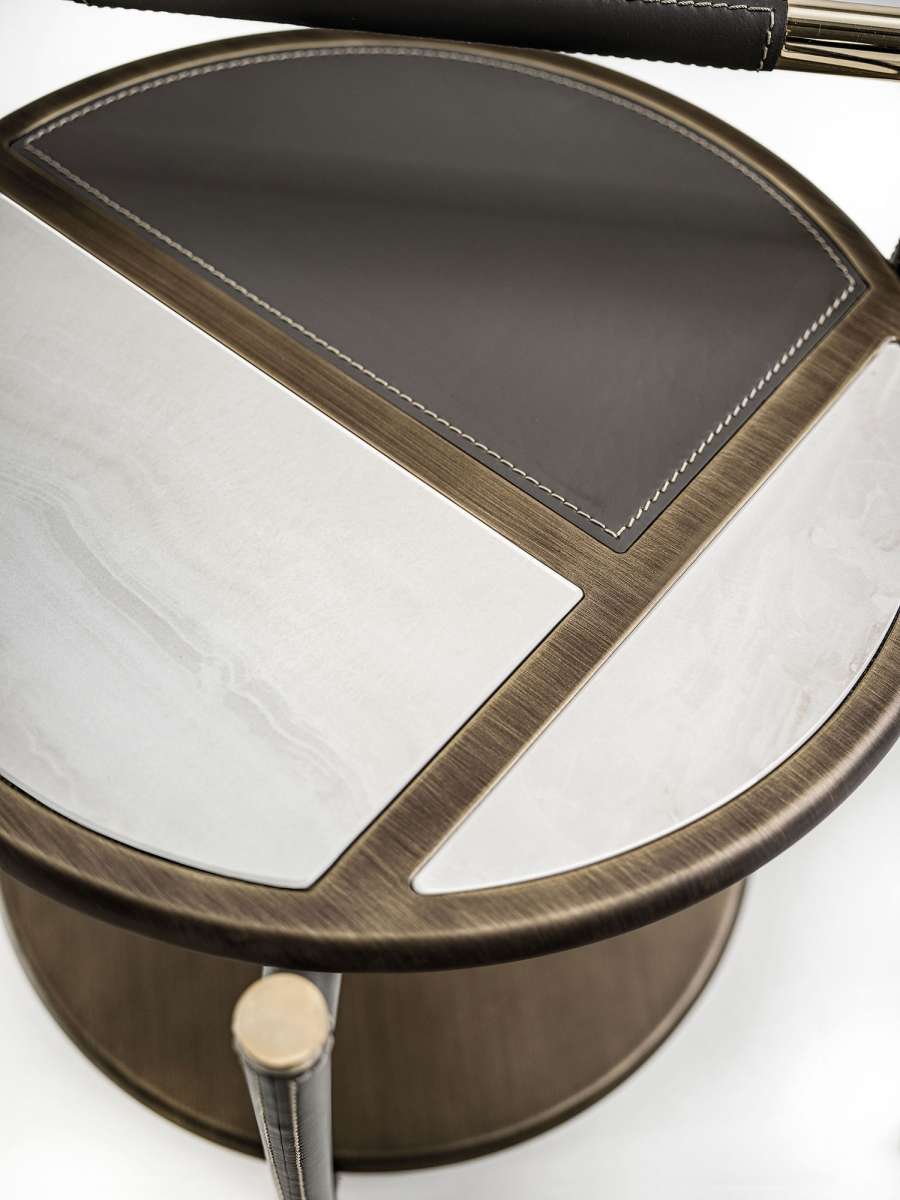 Столики Araldo предлагают ряд ярких и приятных решений для оформления интерьера, отличающихся отделкой и деталями, характерными для коллекции Vittoria Frigerio. Гармония материалов, фактур и цветов – результат тщательного поиска, сочетающегося со смелостью и аутентичностью. Кромка столешницы и нижней полки выполнена из дерева с бронзовой патиной, а столешница украшена вставками из керамогранита с мраморным эффектом и кожи Cuoio. Каркас также обтянут кожей Cuoio и дополнен металлическими деталями с золотистым хромом. Araldo – это предмет мебели, манифестом которого является строгость.