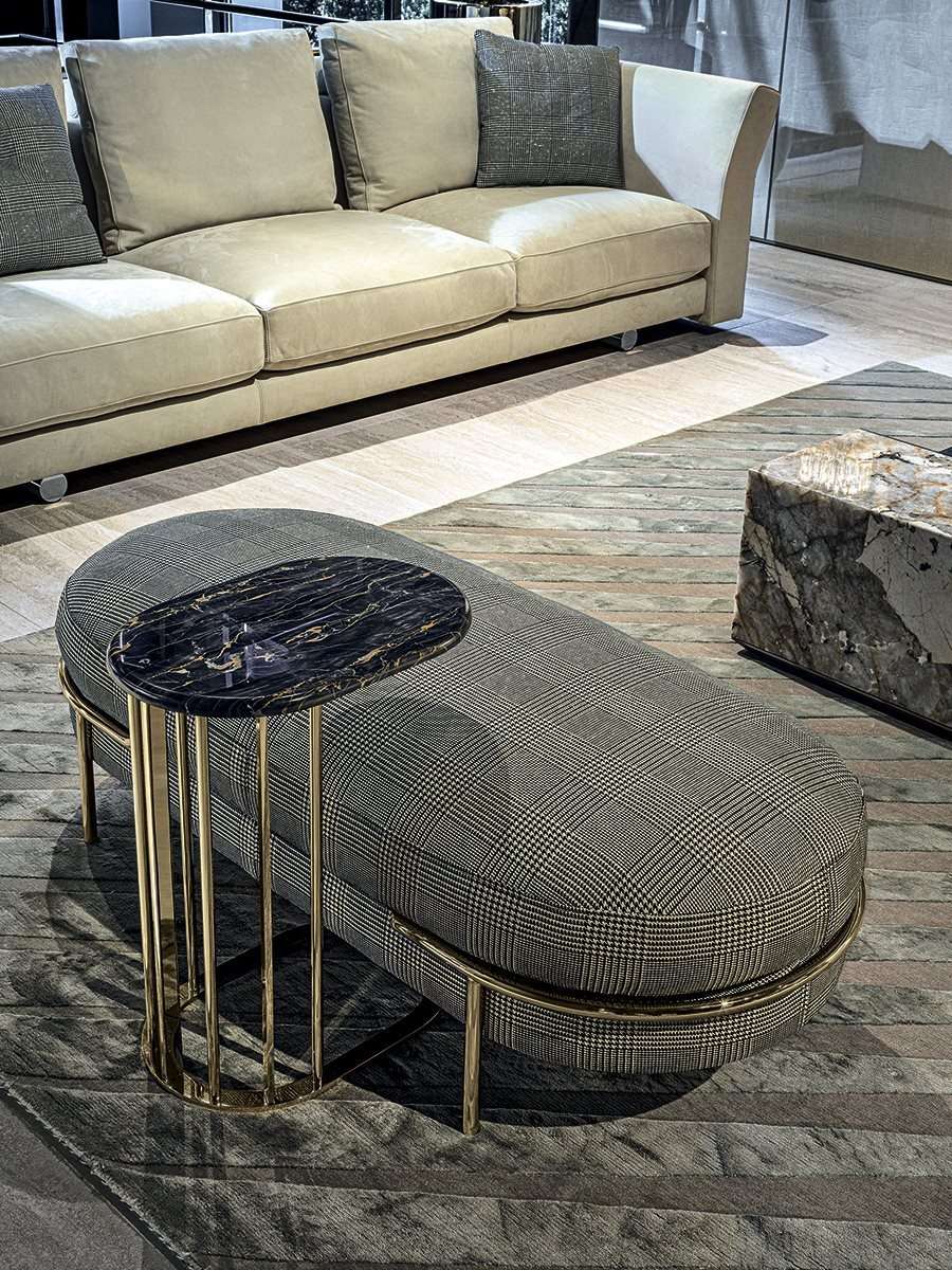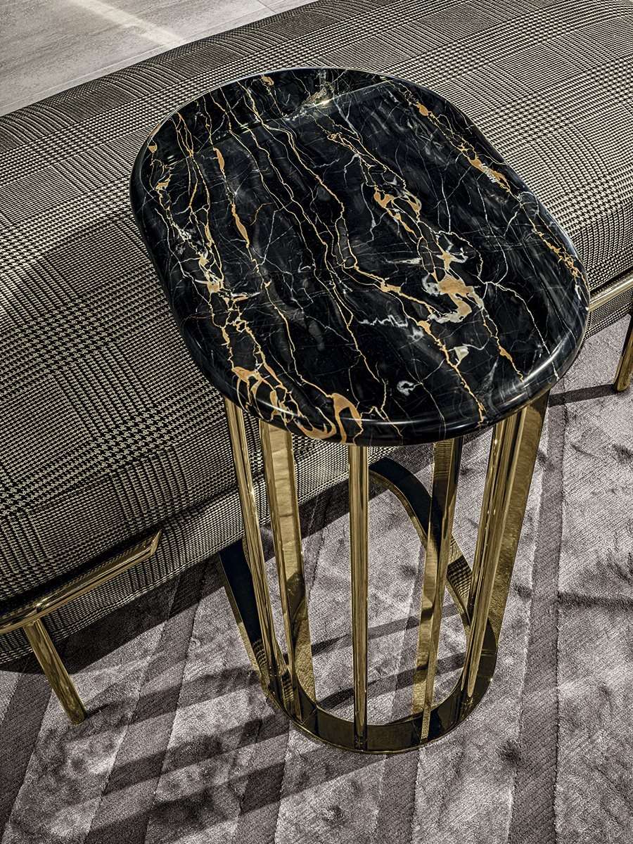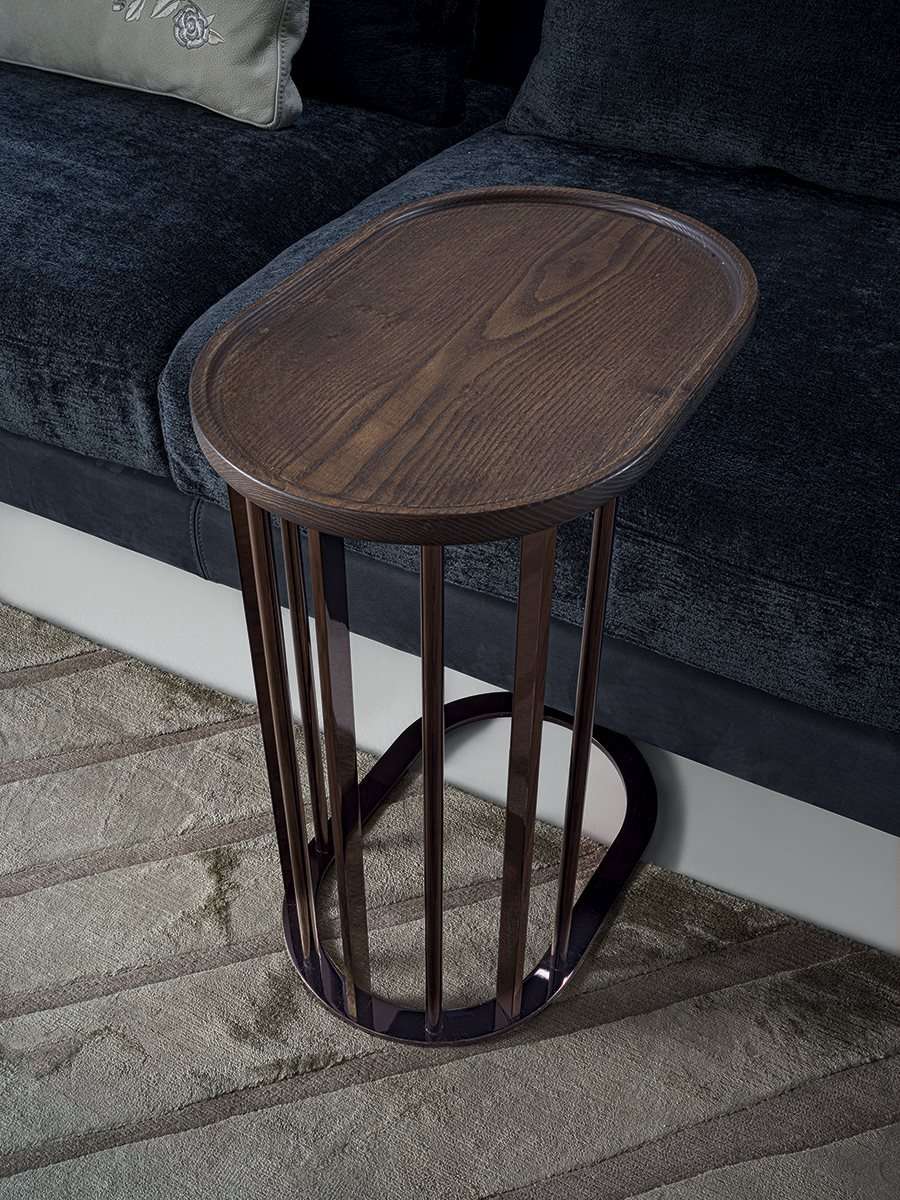 Столик Balmain, лаконичные очертания и выбор материалов которого навеяны стилем модерн, имеет сложную металлическую структуру с чередующимися круглыми и квадратными соединительными прутками. Balmain, как и столик Kobe, при необходимости можно придвинуть к дивану или креслу и использовать в качестве практичной опорной поверхности для стакана, книги или другого предмета.