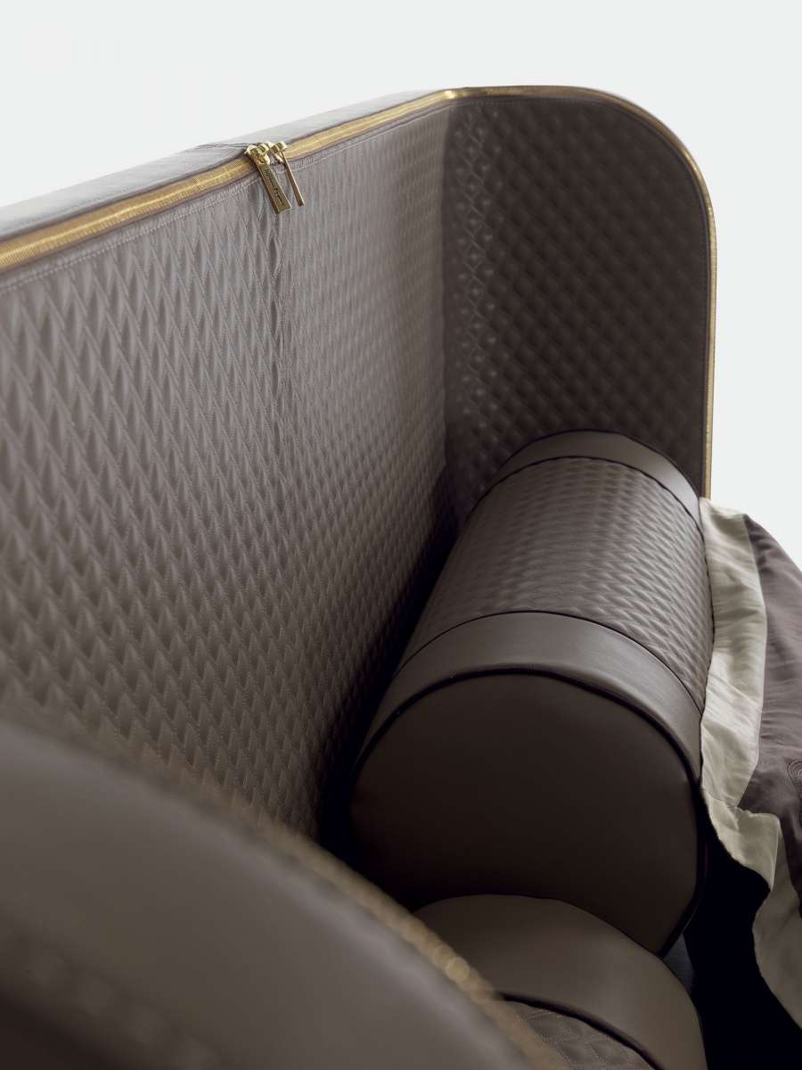 Кровать Bellini High становится главным героем спальной зоны благодаря своему изысканно-простому дизайну. Величественное изголовье украшено стёганой вставкой, застёгнутой на молнию золотого или чёрного цвета. Подушки-валики, украшенные той же стёжкой, что и изголовье, и оснащённые подъёмным механизмом, обеспечивают дополнительный комфорт. Кровать Bellini создаёт ощущение порядка и покоя благодаря сбалансированности своих изысканных форм.