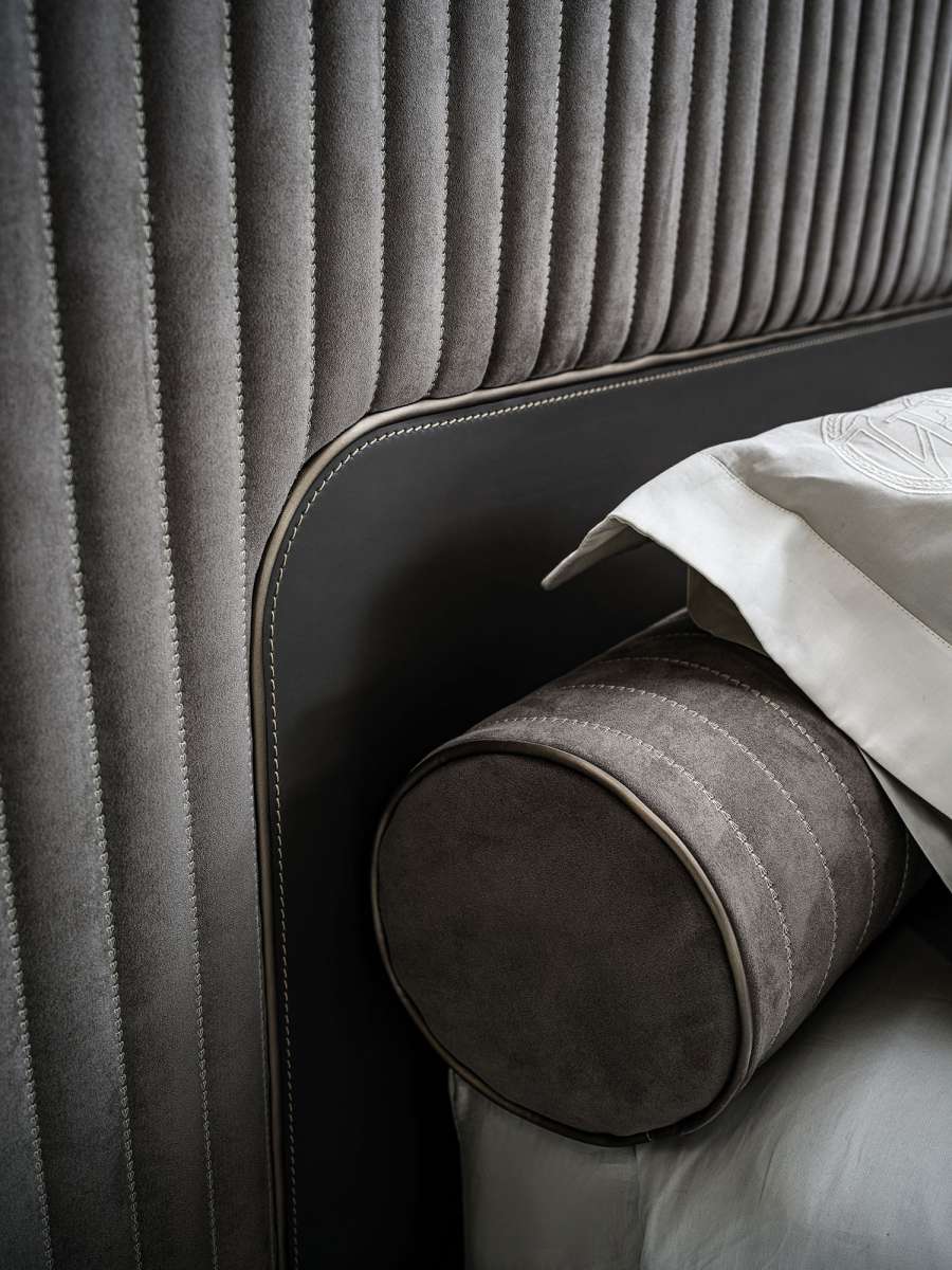 Величественное изголовье – главная особенность кровати Capua. Оно украшено вертикальной стёжкой, которая обволакивает каркас кровати, подчёркивая детали из кожи, расположенные вдоль каркаса и изголовья. Повторение вертикальных полос создаёт редкий визуальный баланс, создавая особый и узнаваемый ритм. Кровать Capua, бесспорно, главный герой спальной зоны, привносит нотку гламура без излишеств.