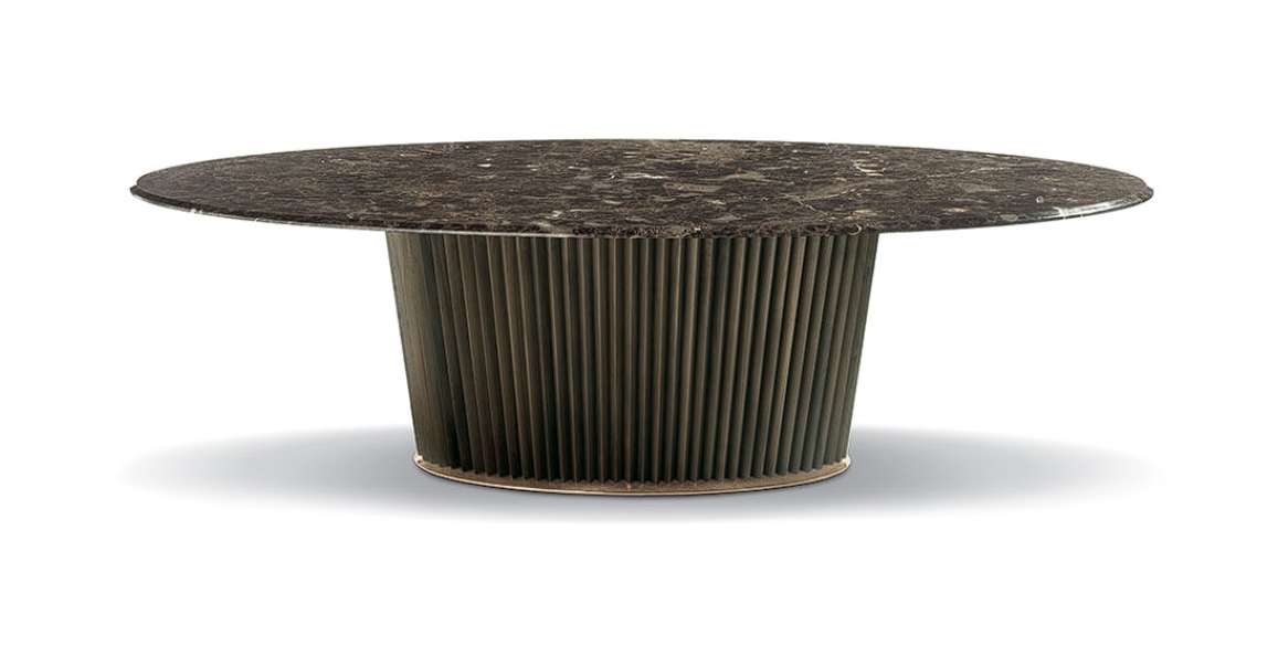 Стол Colonna — бесспорный властелин столовой. Его отличает необычное монолитное основание из патинированного бронзового лакированного дерева с густой чередой острых углов по всему периметру, создающих эффект звездообразности. Основание опирается на металлическую пластину с отделкой из коллекции Vittoria Frigerio. Овальная столешница выполнена из мрамора со скошенным профилем. Простой, но насыщенный дизайн подчёркивает стремление коллекции к роскоши.