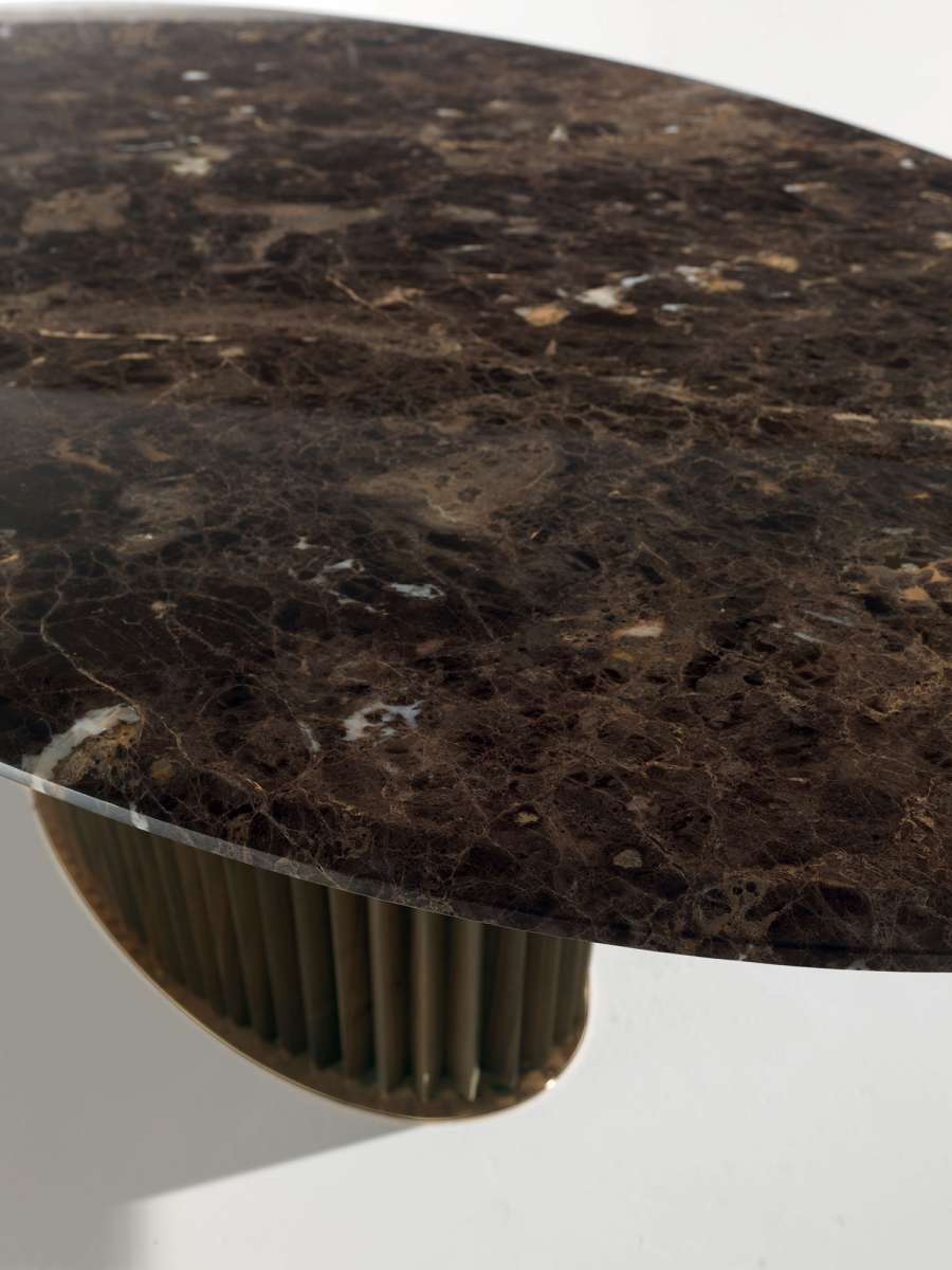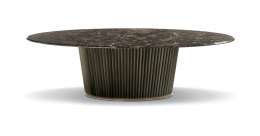 Стол Colonna — бесспорный властелин столовой. Его отличает необычное монолитное основание из патинированного бронзового лакированного дерева с густой чередой острых углов по всему периметру, создающих эффект звездообразности. Основание опирается на металлическую пластину с отделкой из коллекции Vittoria Frigerio. Овальная столешница выполнена из мрамора со скошенным профилем. Простой, но насыщенный дизайн подчёркивает стремление коллекции к роскоши.