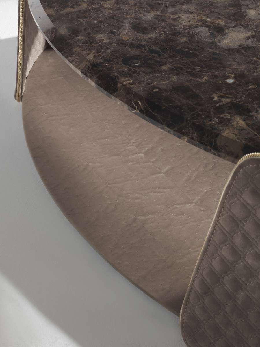 Столики Contarini – настоящий манифест роскошной изысканности и портновского мастерства Vittoria Frigerio. В этом смысле Contarini – это триумф изысканных деталей и отделок: мрамор, дерево, ткани и кожа создают неповторимые и полностью персонализированные сочетания. Contarini, как и другие изделия одноименной серии, доступен в двух вариантах: металлический каркас, обтянутый тканью или кожей, может быть украшен элегантной стёжкой или, в качестве альтернативы, изящной тиснёной вышивкой. Изящная молния украшает сшитые детали. Верхнюю мраморную столешницу можно выбрать из коллекции Vittoria Frigerio, а нижнюю – из дерева.