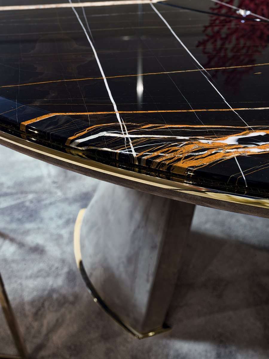 Стол Damien отличают элегантность и извилистость форм. Грациозные обтянутые кожей ножки из пеноматериала высокой структурной плотности, полученные в эксклюзивной пресс-форме, придают столу обтекаемую форму. Периметральный профиль мраморной столешницы выполнен с металлической кромкой.