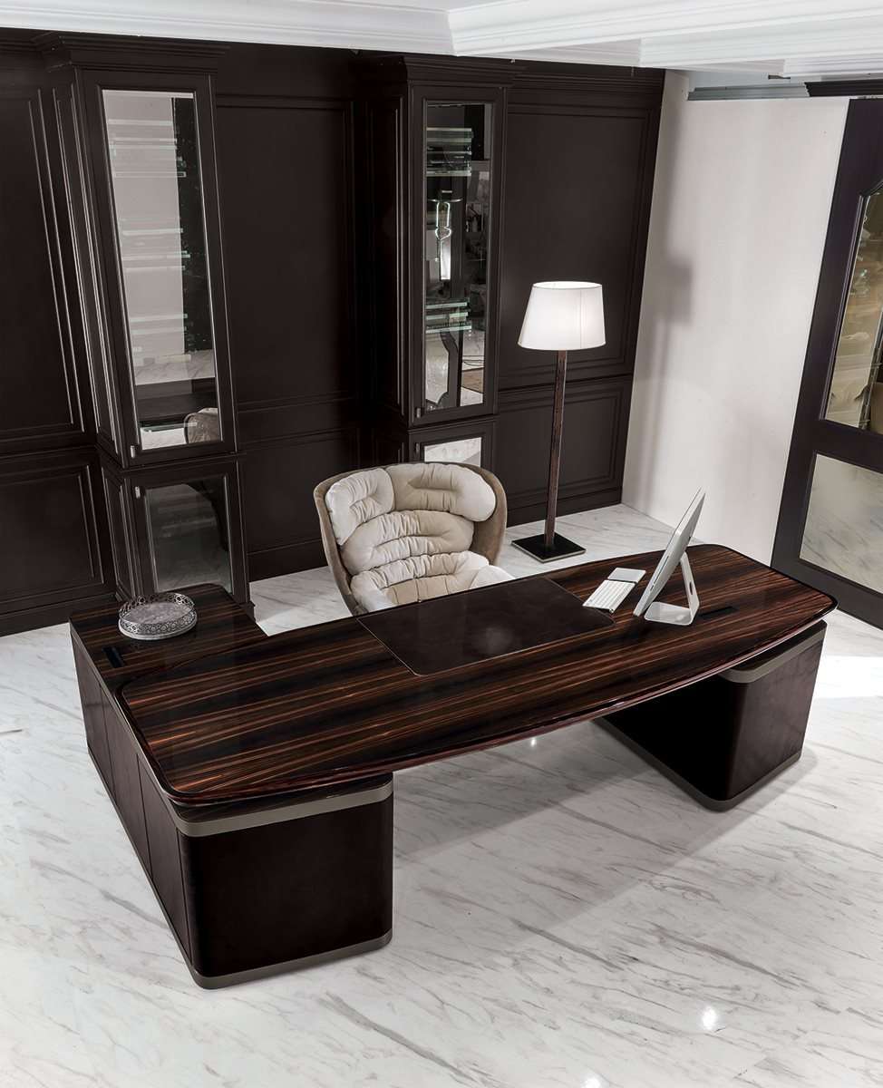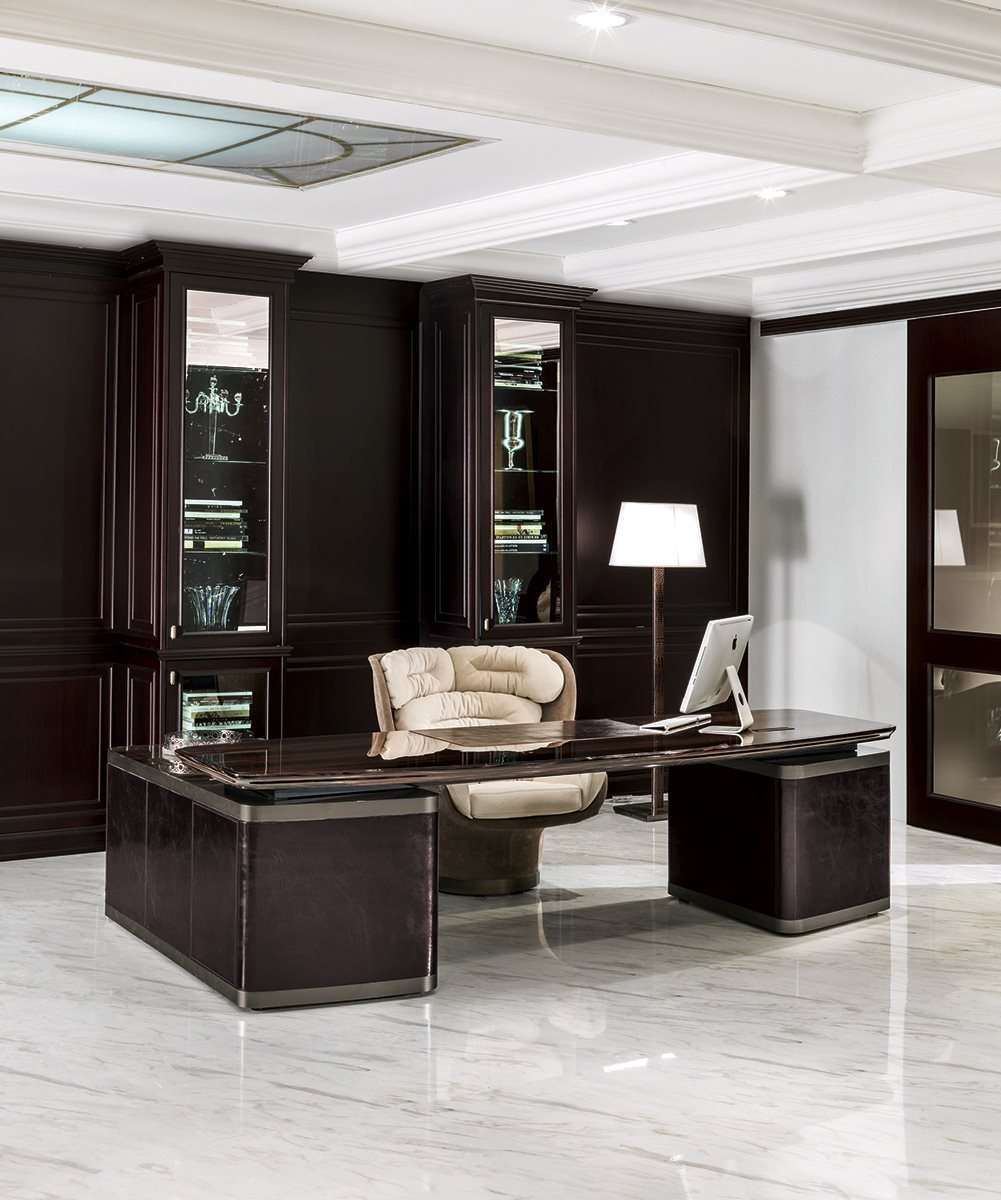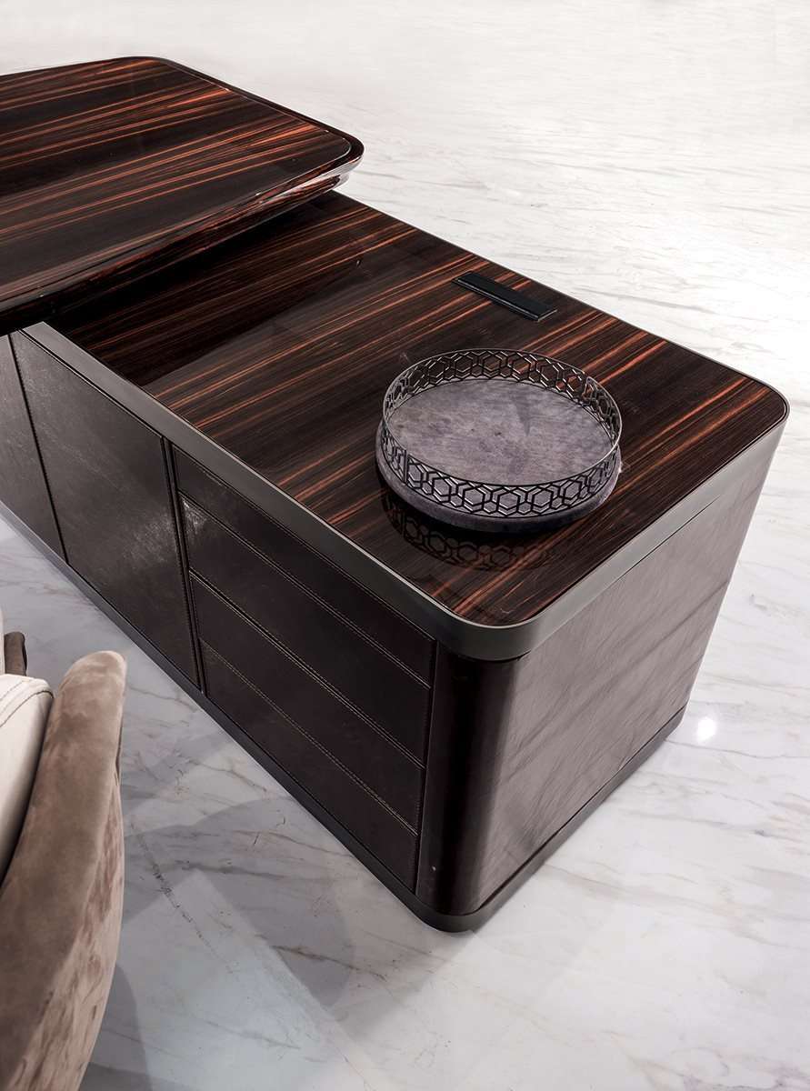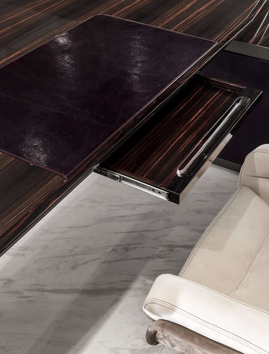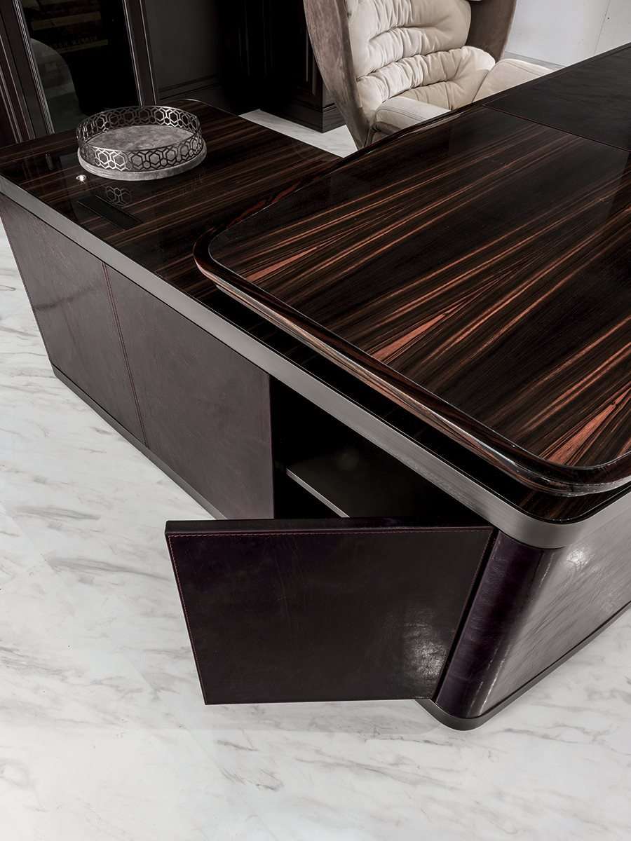Функциональный и солидный стол Ector, предлагаемый в двух вариантах: с полуостровным элементом, оборудованным нишами и тумбами, или без него. Стол выполнен полностью из дерева, облицованного шпоном благородных древесных пород, таких как эбеновое дерево или орех Canaletto, и отличается кромкой из профилированного массива и поверхностями, обитыми кожей. Ector - это сочетание утонченных материалов и ценных деталей, которые подчеркивают его элегантный и изысканный характер.