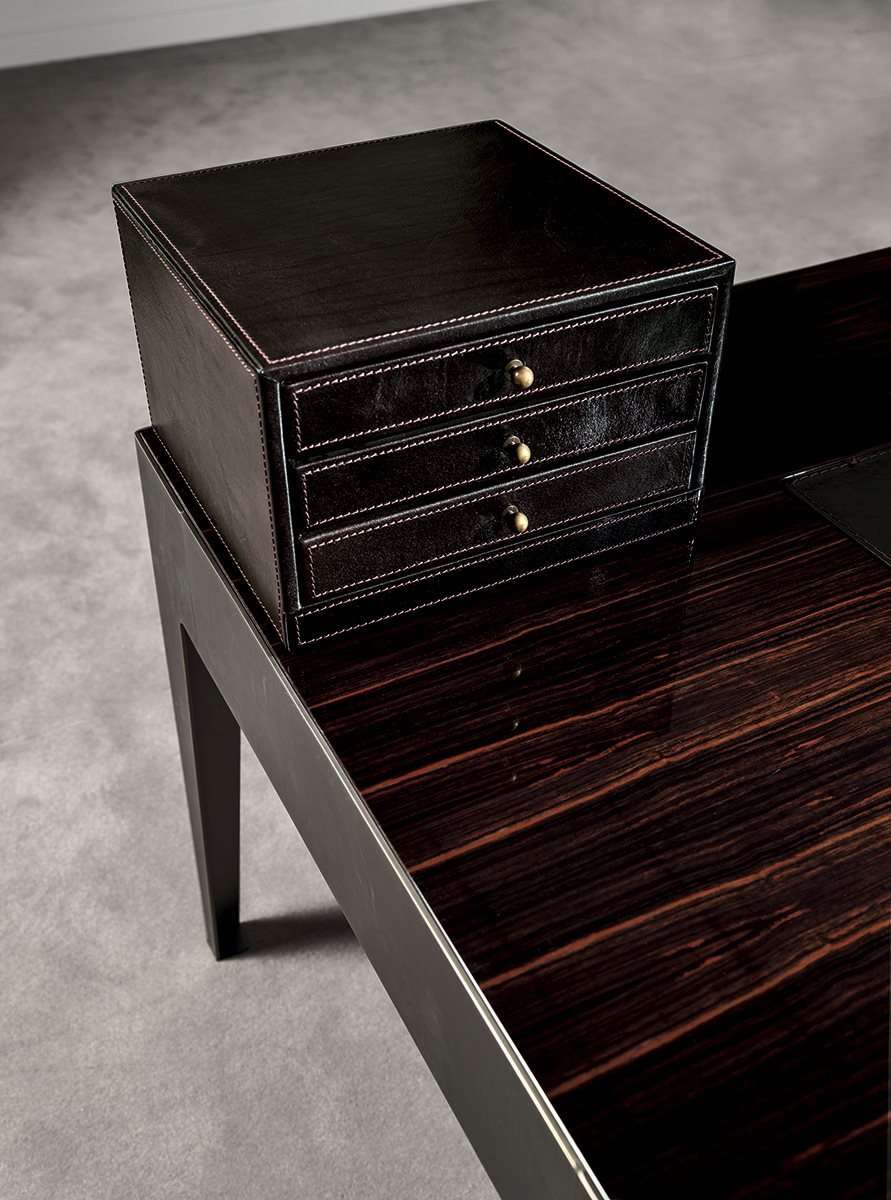 Письменный стол Gorky объединяет функциональность и лаконичный дизайн и гармонично выглядит как в гостиной, так и в ночной зоне. Основание изделия выполнено из металла, а под столешницей предусмотрен практичный ящик. Столешница изготовлена из дерева с кожаной вставкой. В качестве опции предлагается практичная деревянная тумба для установки под письменным столом и удобная мини-тумба для размещения на столешнице, полностью обитая кожей.