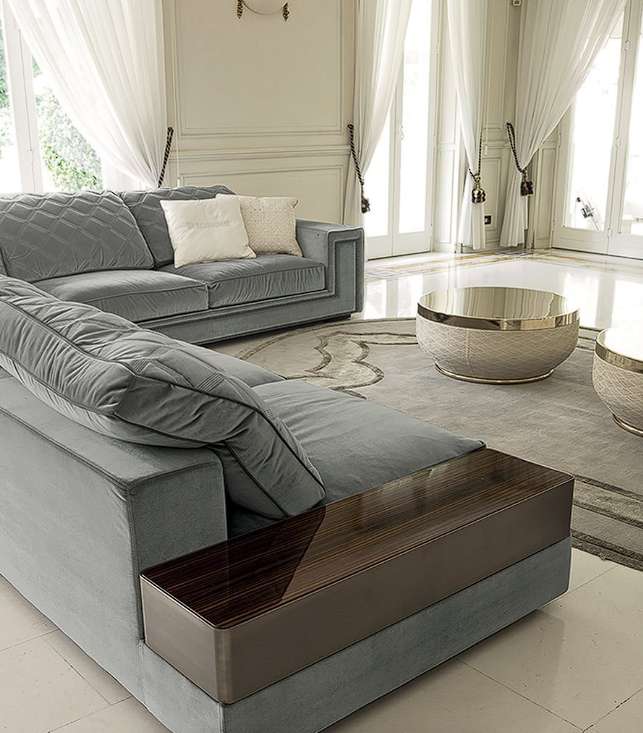 Диван HELMUT отличается подушками спинки, наполовину прошитыми в виде ромбов, и передним каркасом, украшенным обильной отделкой пуговицами. Возможно добавление особых элементов, таких как открытый угол или низкий подлокотник со вспомогательной поверхностью из дерева или оникса с подсветкой. Все эти детали создают уникальный и изысканный эстетический эффект. Инновационное проектирование интерьера гостиной через систему сидений, которая может обращаться к множеству элементов, обладающих различными характеристиками, яркой эстетической индивидуальностью, элегантными пропорциями и несравненным комфортом.