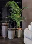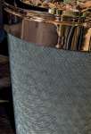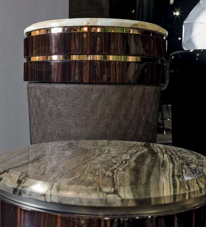 Столик и кашпо цилиндрической формы с каркасом из стеклопластика, обтянутым кожей или тканью, и декоративными кольцами из дерева с металлическими профилями. Предлагается в двух вариантах высоты одного диаметра и большим разнообразием отделки. Оригинальный, особенный элемент обстановки, который при использовании в группе привносит гармоничность в помещение, хроматически украшая любой уголок.