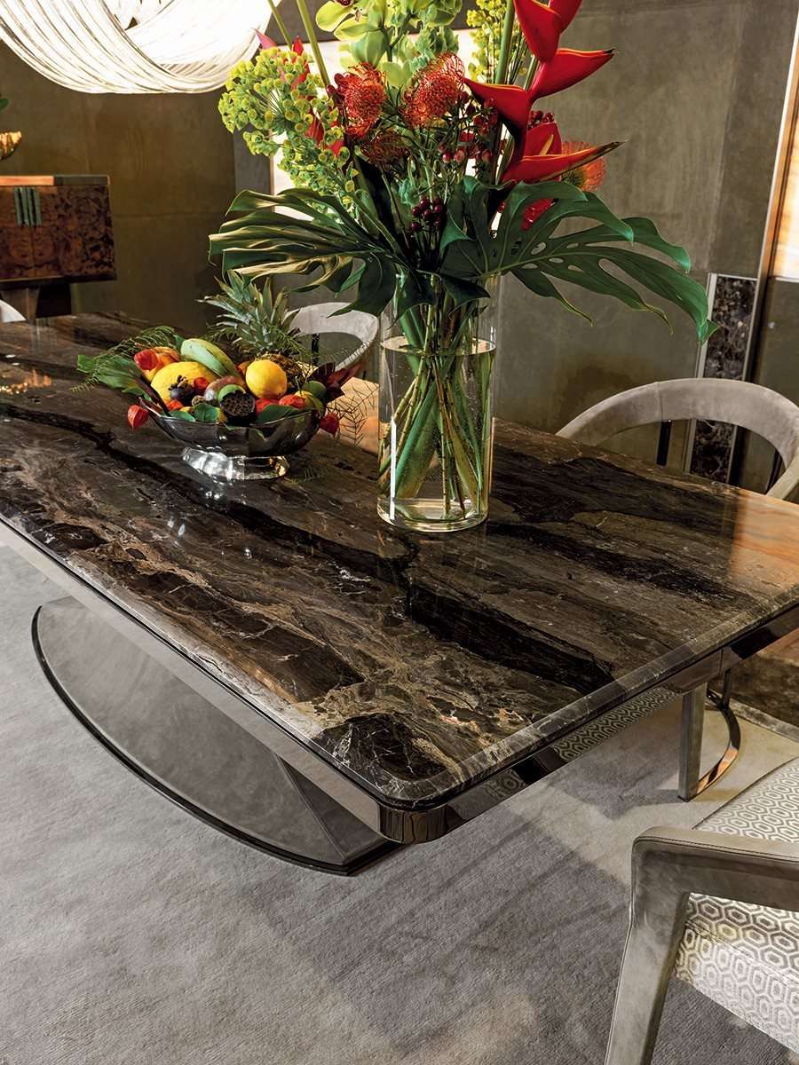 Солидный стол, отличающийся утонченным дизайном и сочетанием изысканных материалов. Каркас обладает очень гармоничным рисунком, а основание выполнено из стеклопластика, обитого кожей, с металлической отделкой. Скошенные углы мраморной столешницы придают линии изделия дополнительную мягкость.