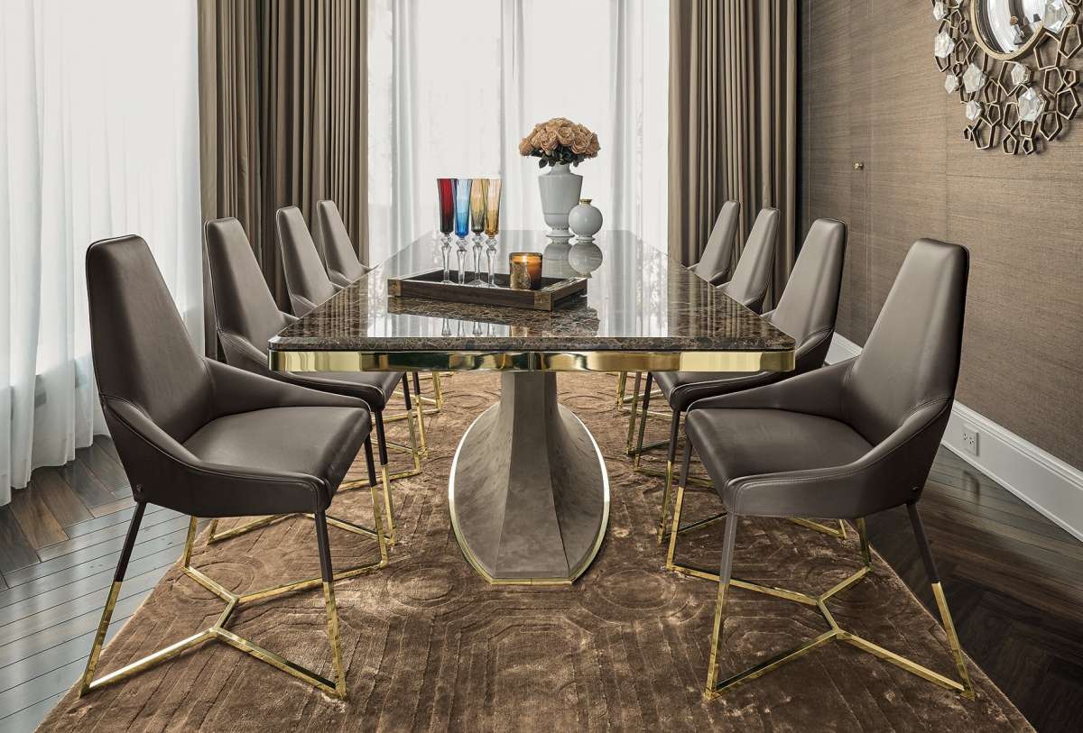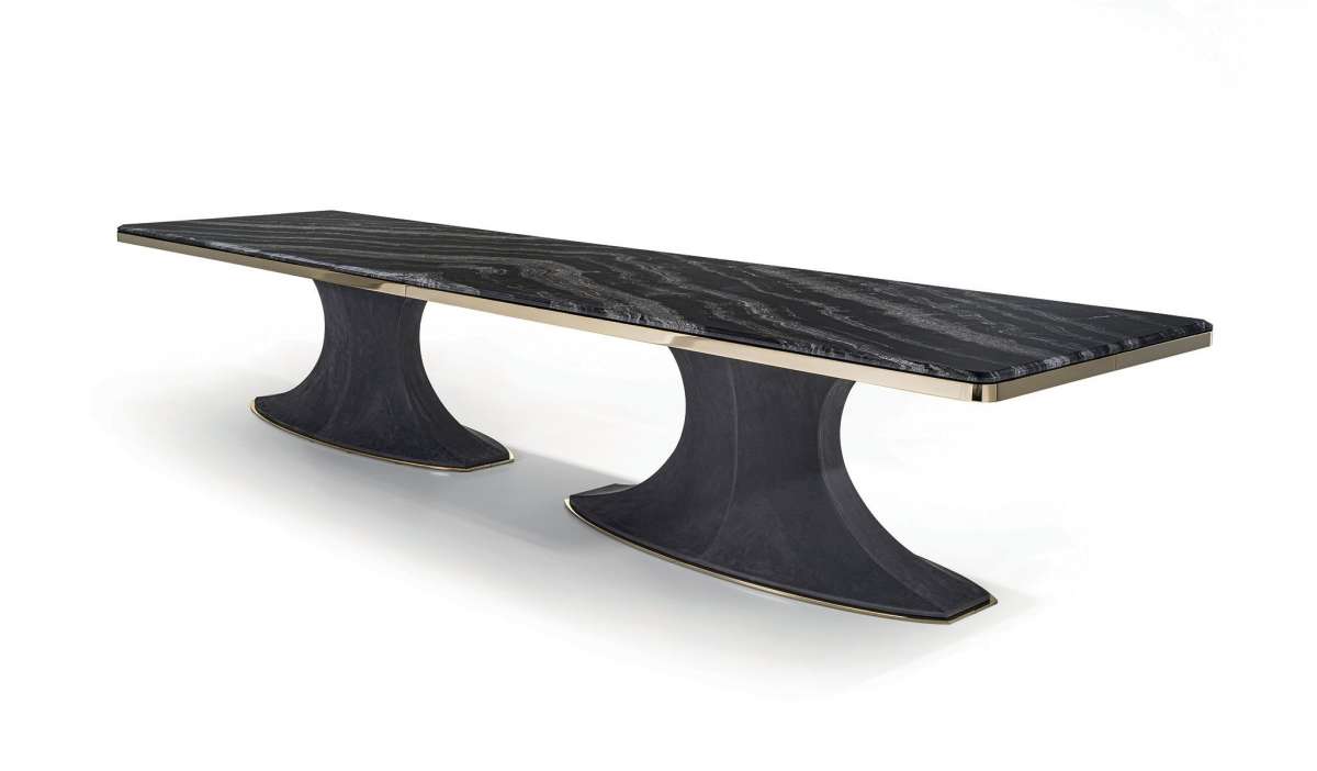 Солидный стол, отличающийся утонченным дизайном и сочетанием изысканных материалов. Каркас обладает очень гармоничным рисунком, а основание выполнено из стеклопластика, обитого кожей, с металлической отделкой. Скошенные углы мраморной столешницы придают линии изделия дополнительную мягкость.