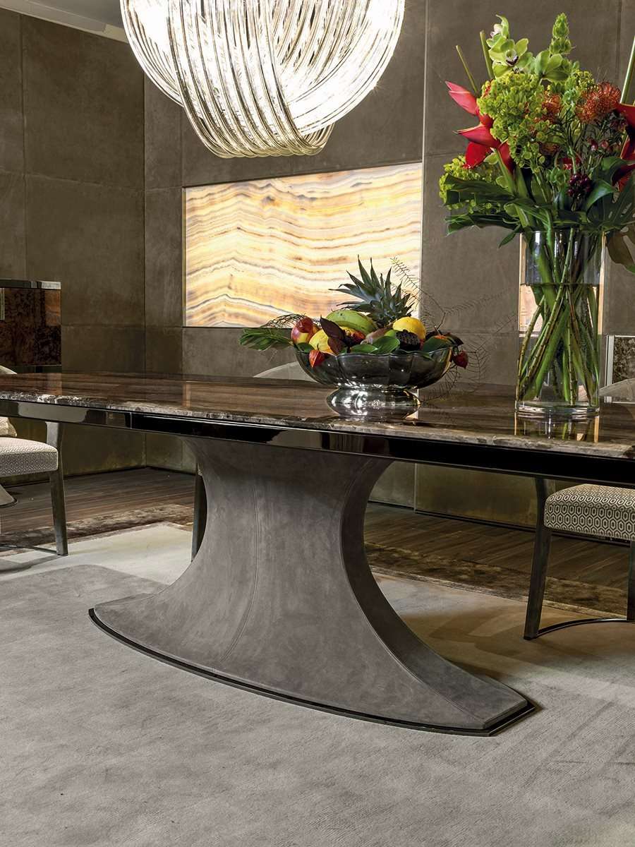Солидный стол, отличающийся утонченным дизайном и сочетанием изысканных материалов. Каркас обладает очень гармоничным рисунком, а основание выполнено из стеклопластика, обитого кожей, с металлической отделкой. Скошенные углы мраморной столешницы придают линии изделия дополнительную мягкость.