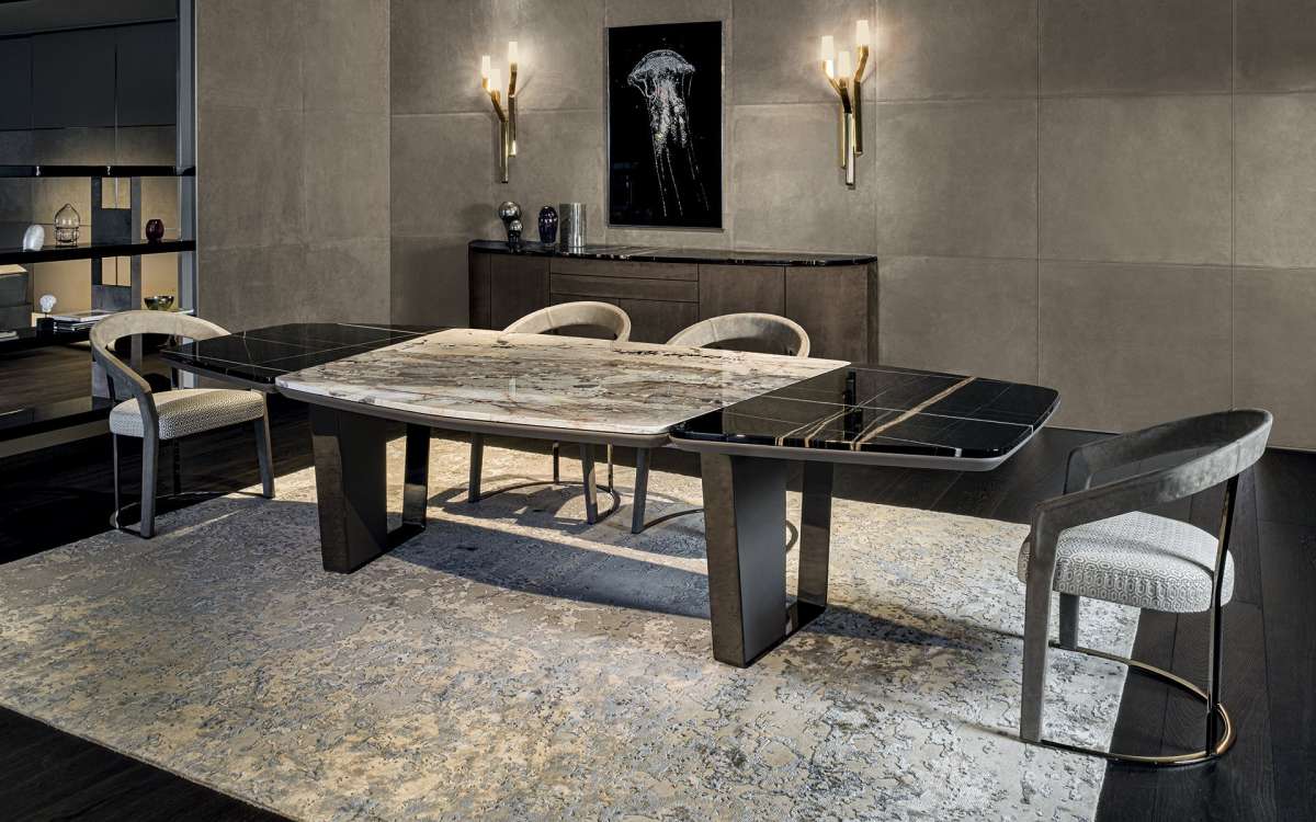 Keope - стол с профильной столешницей с секциями из разных материалов и 2 трапециевидными ножками со вставкой из кожи или дерева. Солидный и эффектный, он выпускается со столешницей, разделенной на 2 или 3 части. Коллекция Keope, включающая стол, консоль и тумбу, выражает непреходящую элегантность, вдохновленную динамизмом подлинного современного шика, в котором изысканные материалы, ценные разновидности мрамора и чистые формы пробуждают ощущения, полностью заключающие в себе проектный подход этого бренда.