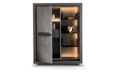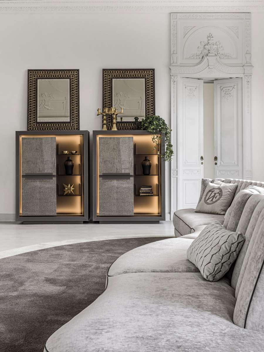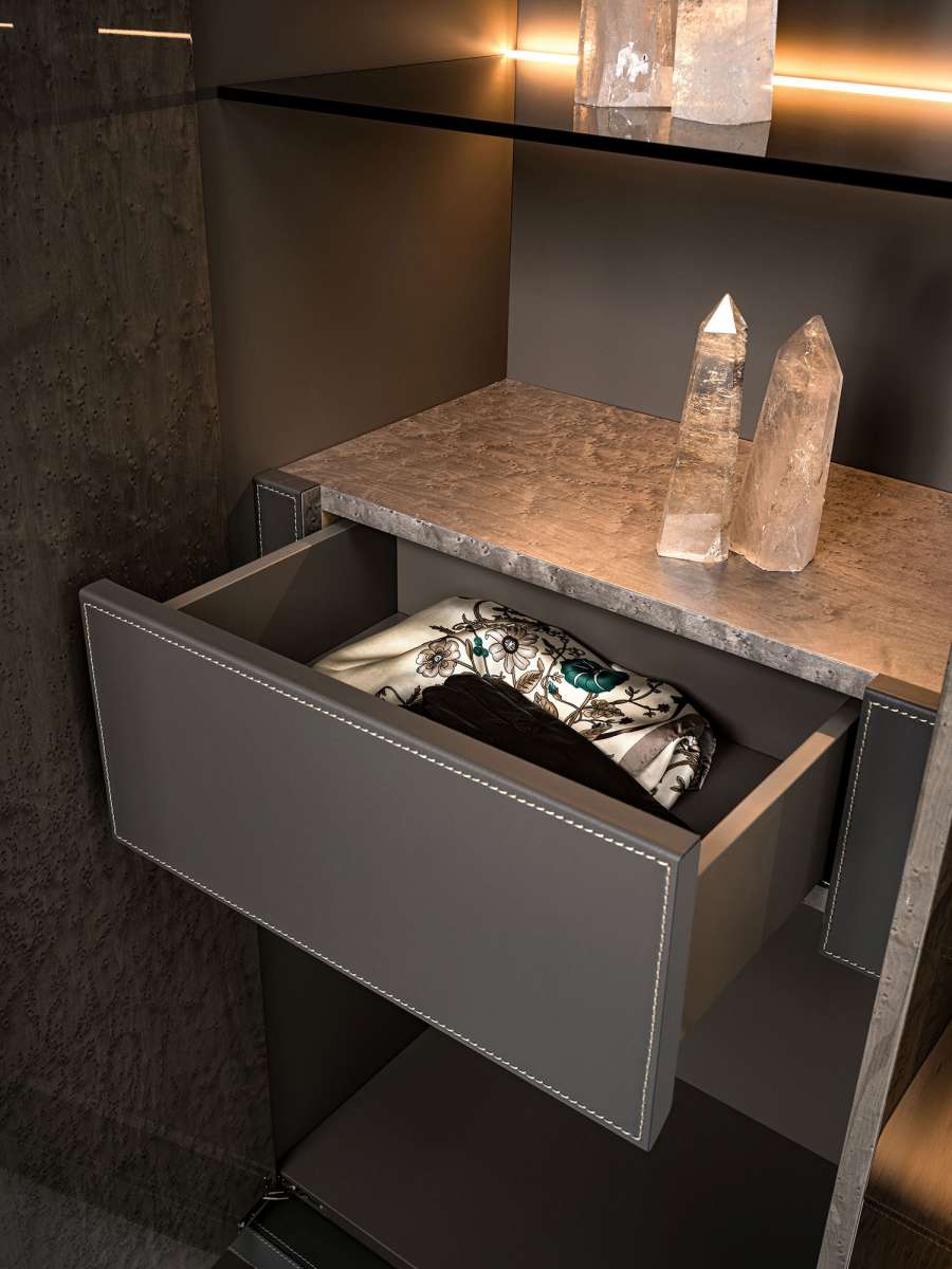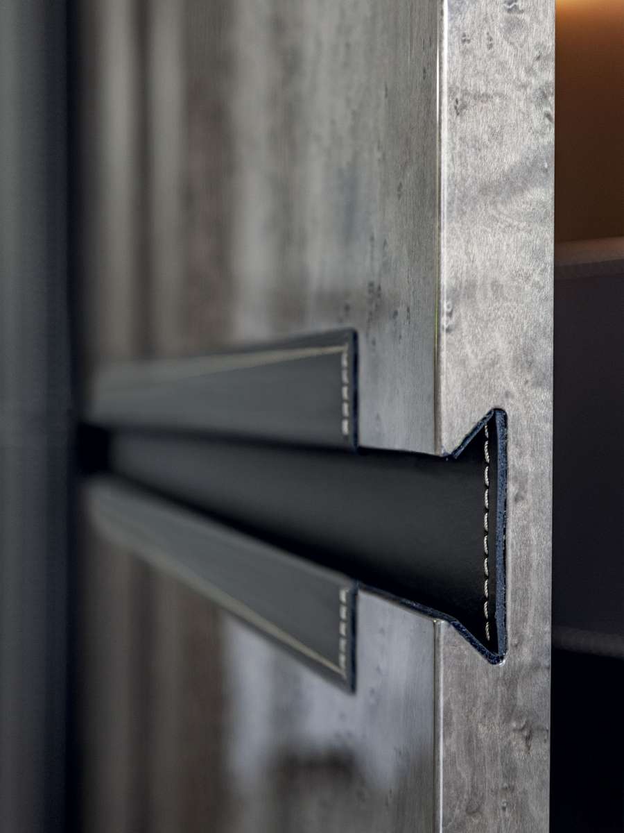 Коллекция Lanza отличается строгостью форм и изысканностью деталей. Строгие линии определяют шкаф Lanza, а сочетание драгоценных материалов делает его уникальным и современным. Внешняя часть обтянута кожей с контрастной строчкой, что подчеркивает мастерство ателье коллекции VF. Детали из кожи повторяются во вставках, которые служат ручками шкафа. Полки и подставки для книг выполнены из стекла бронзового цвета. Светодиодная подсветка завершает образ, добавляя дополнительный штрих роскоши. Элегантный и сдержанный, шкаф Lanza великолепно подходит как для дневной, так и для ночной зоны.