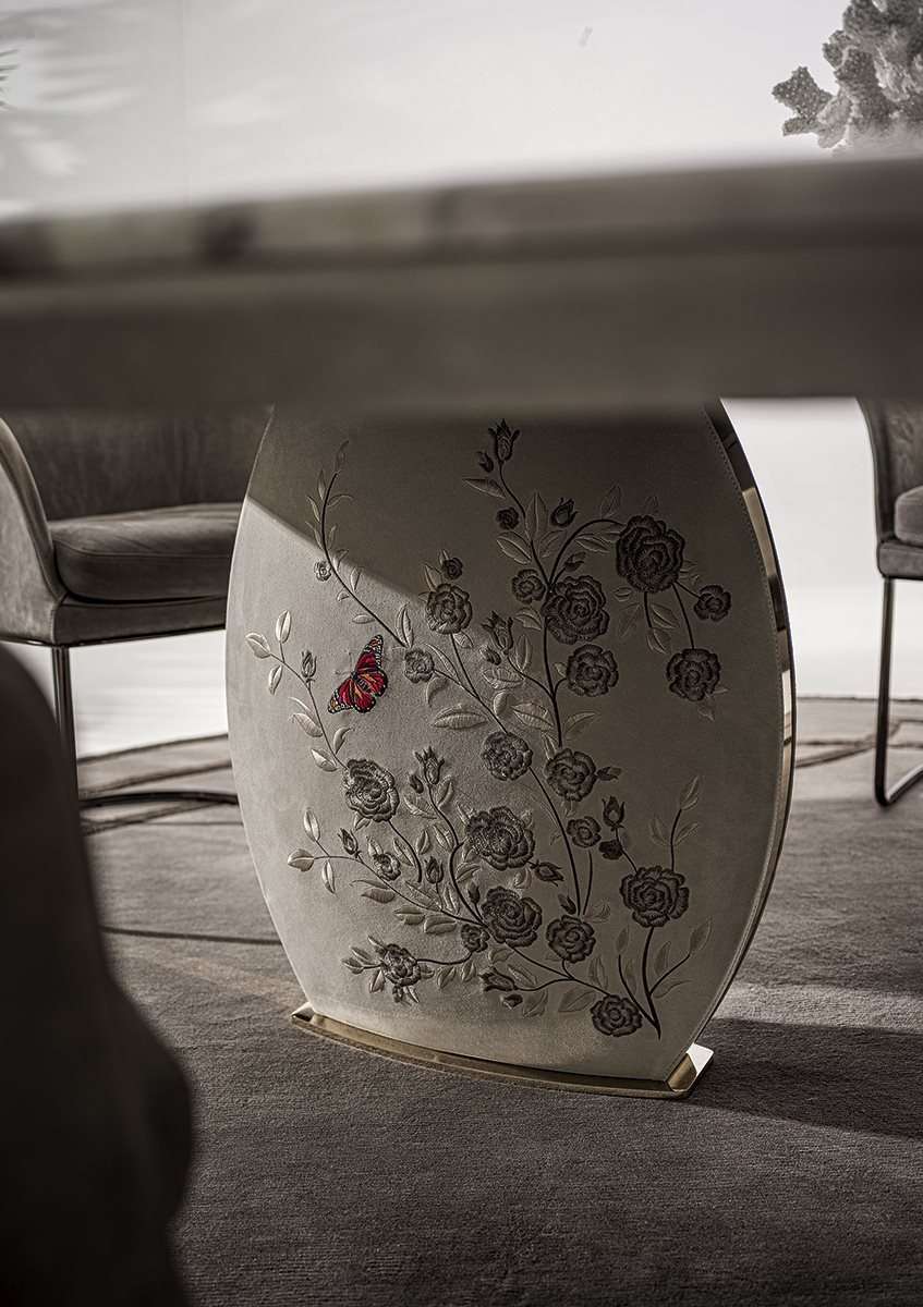 Стол Lotus богато украшен ценными деталями: ножка в виде лепестка, тонкий металлический профиль, столешница с закругленным краем и возможность вставки эксклюзивной вышивки на атласе «Marlène».