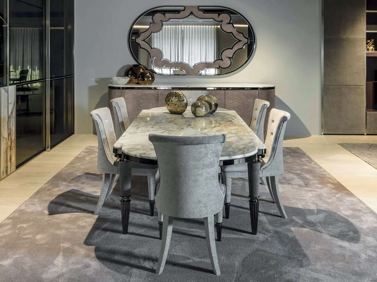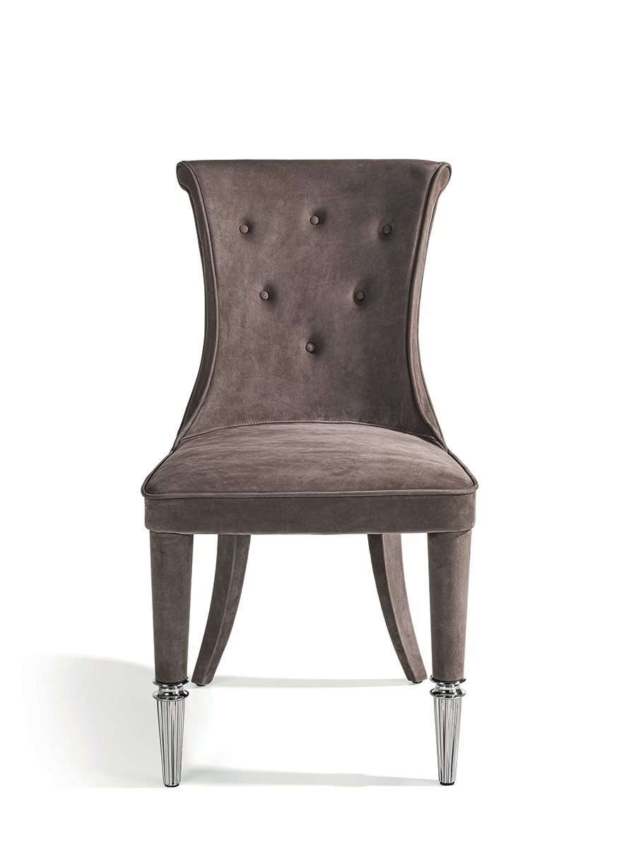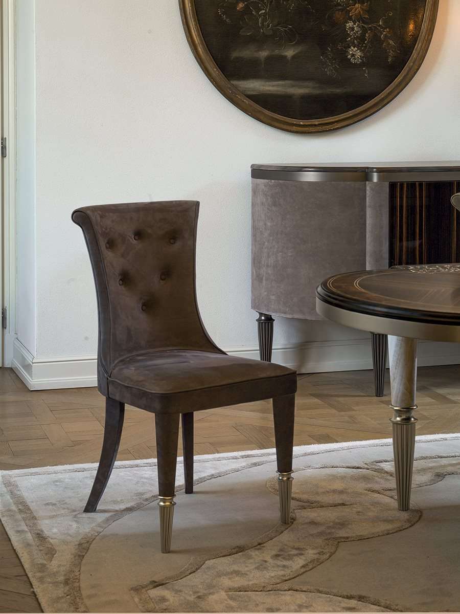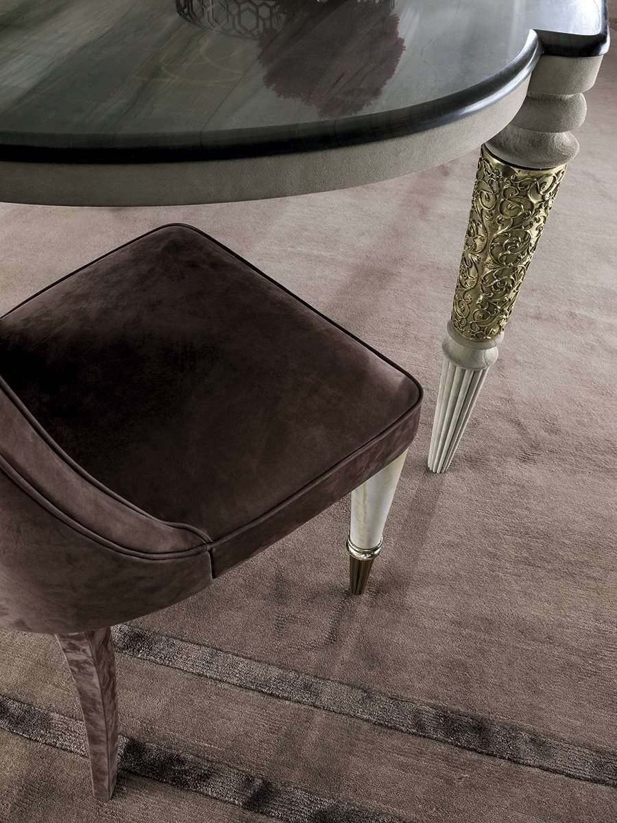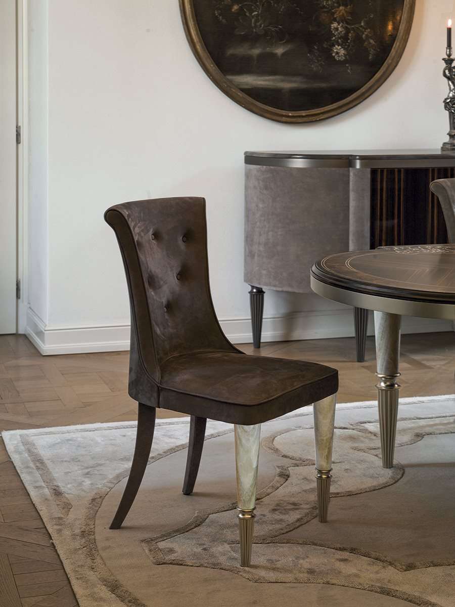 Стул и обеденное кресло Marion, сочетающее в себе различные материалы. Задние ножки изделия выполнены из дерева с кожаной обивкой, а передние ножки состоят из наконечника и деталей из рифленого металла, подвергнутого токарной обработке, а также вставок из оникса, мрамора или кожи, которые создают приятный контраст материалов.