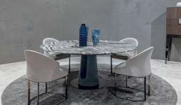 Стол Maverick имеет особое цилиндрическое основание со сквозным отверстием из обтянутого кожей пеноматериала, опирающееся на металлическое кольцо. Maverick, представленный в круглом или овальном варианте, имеет элегантный дизайн и отличается изысканной утонченностью конструктивных деталей и ценной отделки.