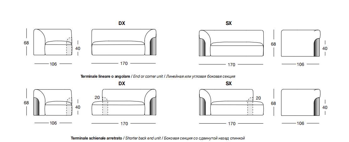 NIP 170х106 см LONGHI Боковая секция со сдвинутой назад спинкой (SX/DX)