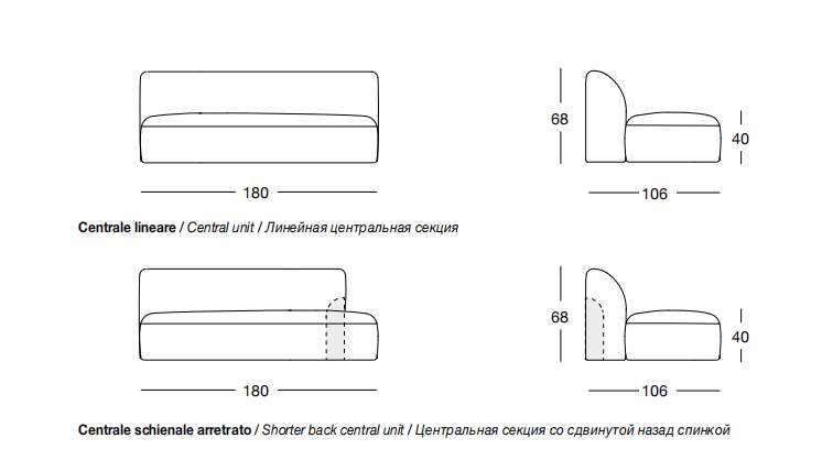NIP 180х106 см LONGHI Центральная секция дивана со сдвинутой назад спинкой