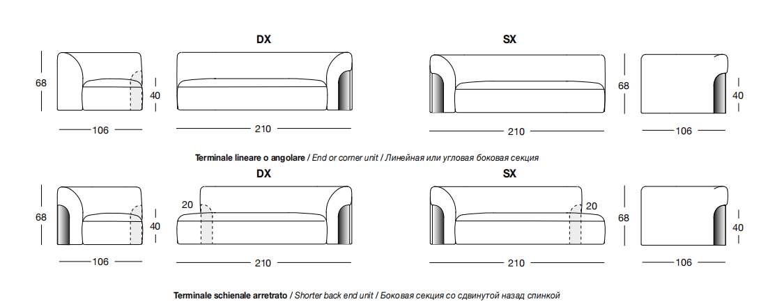 NIP 270х106 см LONGH...NIP 270х106 см LONGHI Боковая секция со сдвинутой назад спинкой (SX/DX)
