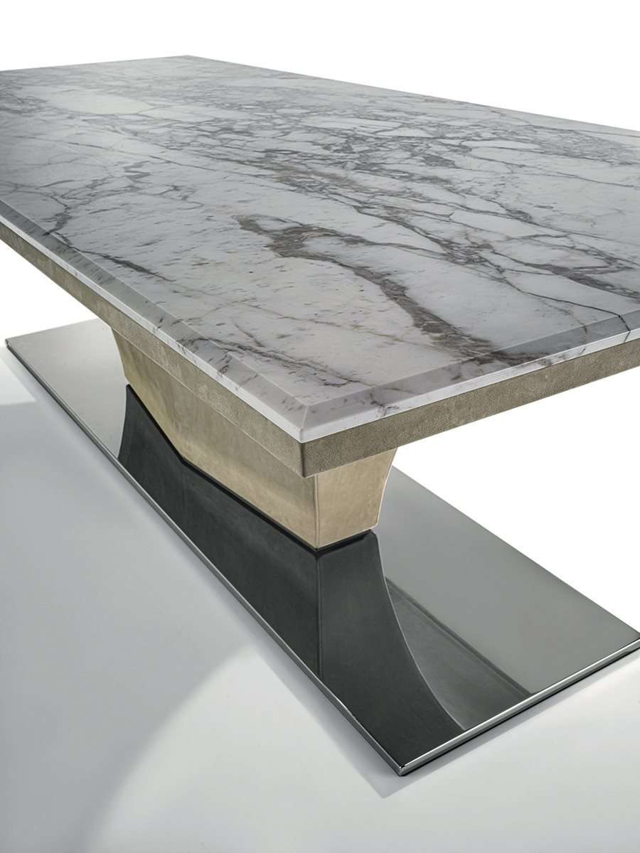 Стол Omotesando отличается изящной солидной рамой с кожаной обивкой и тонким прямоугольным основанием из металла, опирающимся на пол. Стол обладает яркой индивидуальностью и может придать стильный и элегантный характер любому помещению, гармонично сочетаясь со всеми стульями коллекции Longhi.