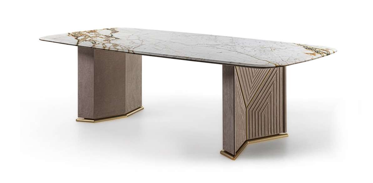 Благородный по своей природе, обеденный стол Pinto от Vittoria Frigerio подчеркивает мастерство дизайнеров коллекции, создавая впечатляющий визуальный эффект и элегантность. Скошенная мраморная столешница доступна в изысканных вариантах отделки; стеганое основание строгой геометрической формы предлагается в двух вариантах, создавая универсальное и изысканное предложение.