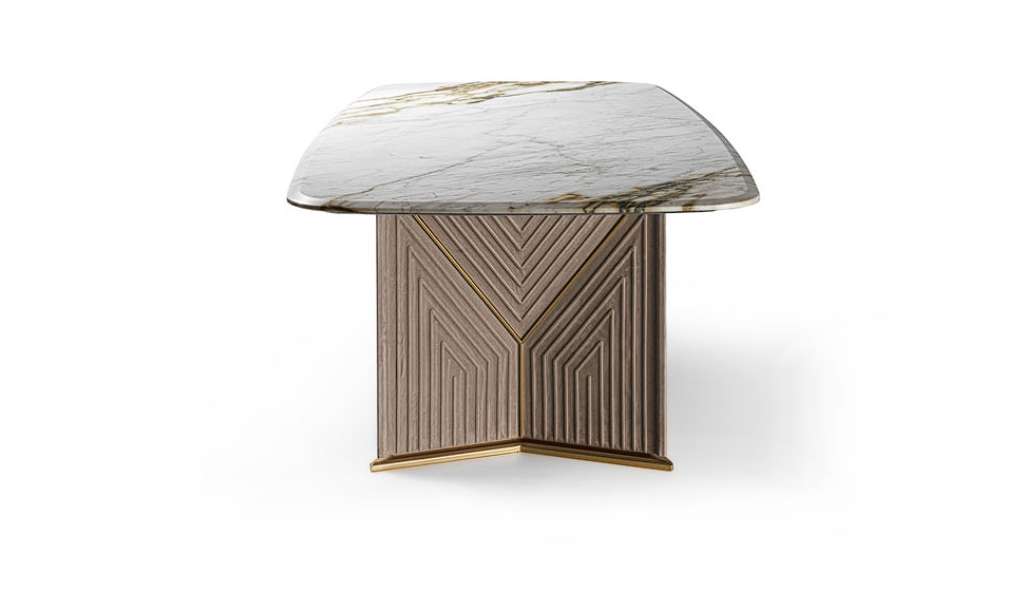 Благородный по своей природе, обеденный стол Pinto от VittoriaFrigerio подчеркивает мастерство дизайнеров коллекции, создавая впечатляющий визуальный эффект и элегантность. Скошенная мраморная столешница доступна в изысканных вариантах отделки; стеганое основание строгой геометрической формы предлагается в двух вариантах, создавая универсальное и изысканное предложение.