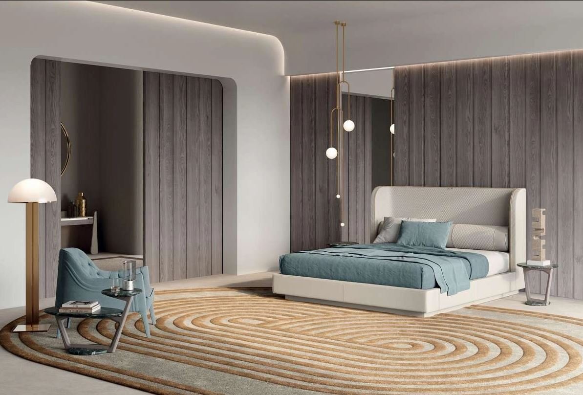 Capua — ода роскоши. Массивное изголовье с вертикальной стёжкой и металлической окантовкой создаёт эффектный визуальный центр. Эта модель идеальна для просторных спален, где требуется подчеркнуть статусность пространства.