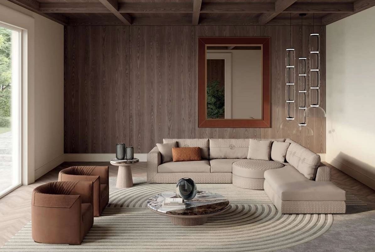 Модульная система Durini — одна из самых выразительных. Её отличает уникальная спинка с элементами из цельного дерева, обитыми тканью или кожей. Благодаря этому диван выглядит как самостоятельный арт-объект.